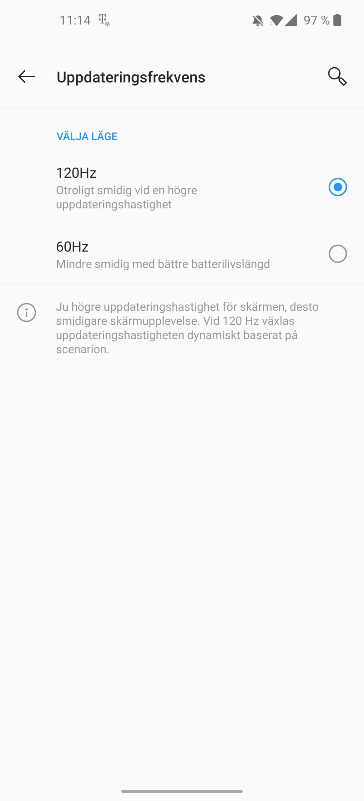 Tack vare en bilduppdateringsfrekvens på hela 120 Hz upplevs gränssnittet flyt och telefonens rapphet i 8 Pro som bättre än någonsin. Det är sannolikt en god bit placeboeffekt, saker går förmodligen egentligen inte speciellt mycket snabbare än i fjol, men jösses vilket intryck av flyt vi bjuds på. Mjukt som smör och snabbt som blixten. OnePlus tillhör en av få tillverkare som dessutom har 120 Hz aktiverat som standard, medan funktionen måste aktiveras av användaren bland flera av konkurrenterna.