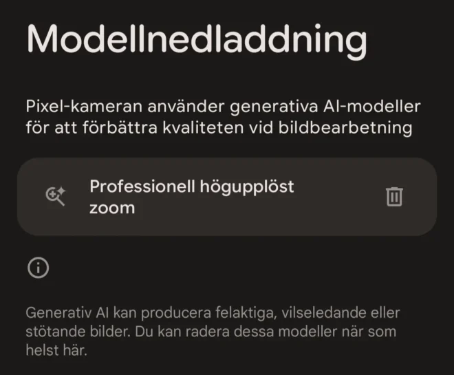När 100x zoom aktiveras i kamera-appen laddas en modell hem. Specialiteten är nämligen att fotografiet förbättras genom lokal generativ AI. Modellen fyller i pixlar, ökar skärpan och förbättrar färgåtergivningen. Med andra ord är slutbilden delvis konstgjord och en uppskattning av hur det kunde ha sett ut med en bättre kamera.