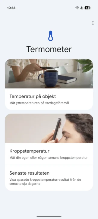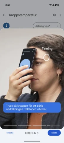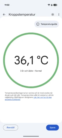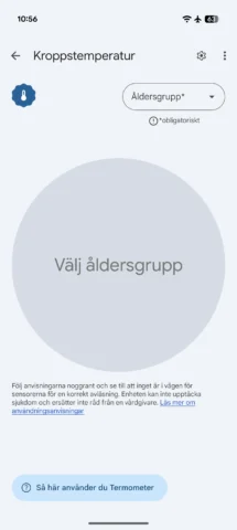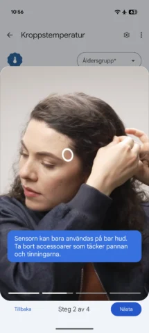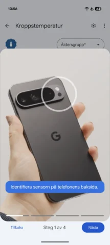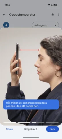 Att mäta kroppstemperaturen för att kolla eventuell feber är lite mer omständligt. Du behöver välja åldersgrupp, hålla telefonen nära pannan och därefter dra telefonen åt sidan tills den pekar mot tinningen. Vid fyra mätningar på raken visade Pixel 10 Pro en kroppstemperatur på 36 eller 36,1 C. En klassisk fristående termometer visade 36,8 C.