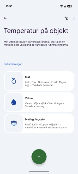 Temperaturen på vilken yta som helst kan mätas genom att bara föra sensorn intill ytan. Ett skrivbord hade exempelvis en temperatur på 19,4 C under förmiddagen. Appen listar kategorier med ”rutinmätningar” för exempelvis maträtter, kaffekoppar och köksutrustning.