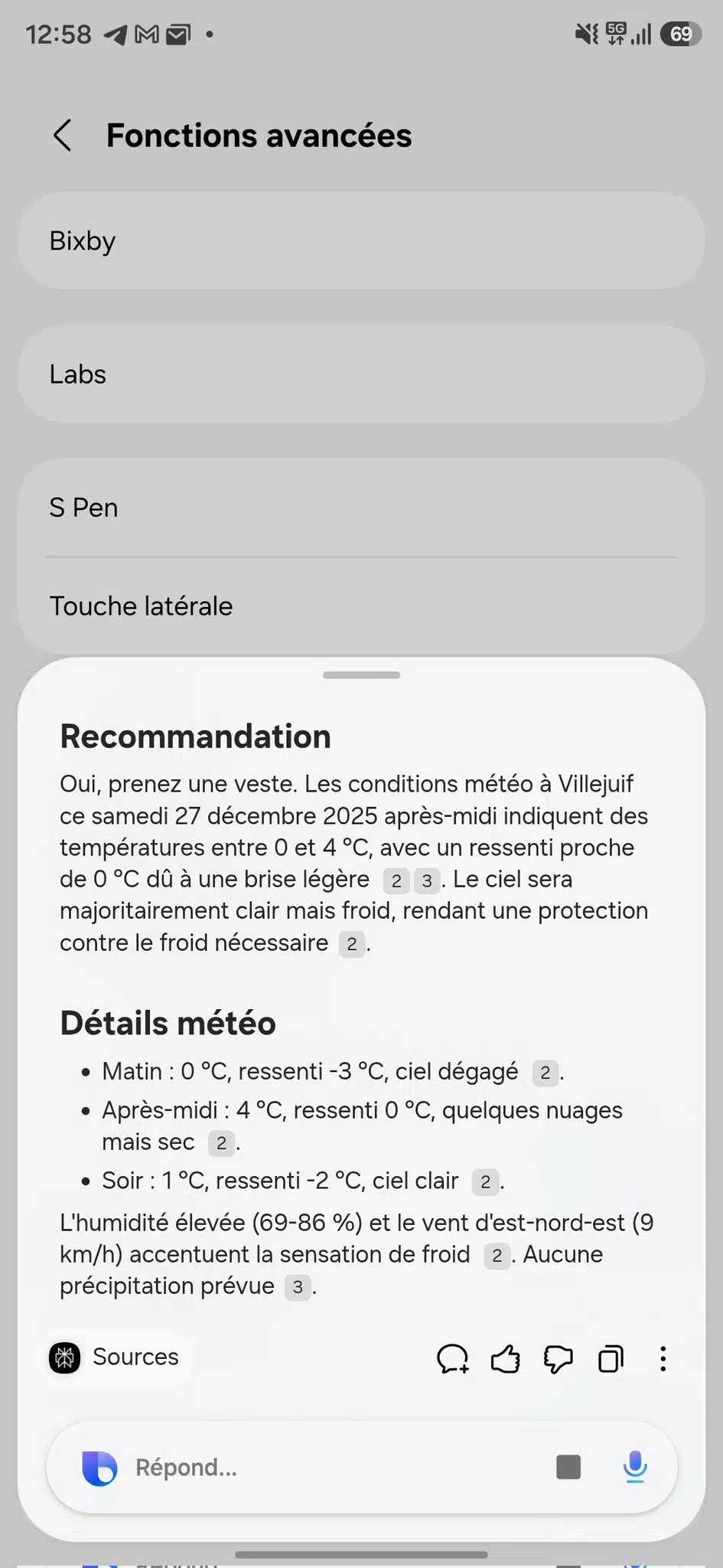 Om Bixby inte klarar av att svara på frågan delegeras uppgiften till Perplexity, i stil med hur Siri får hjälp av Chat GPT. Bixby verkar dock till skillnad mot Siri inte kräva någon bekräftelse innan delegeringen. I skärmbilden nedan syns Perplexity-loggan nere i vänstra hörnet. Även om Samsung anammat Gemini kommer alltså Bixby – som först tillkännagavs våren 2017 – att finnas kvar.