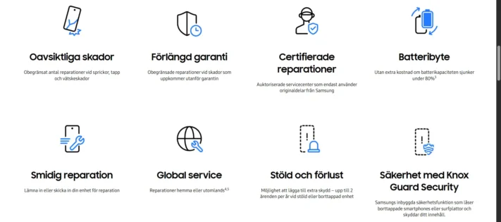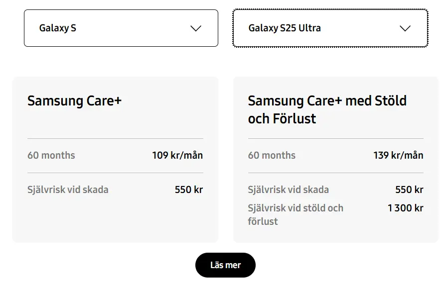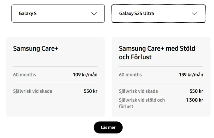 Om batterihälsan sjunker under 80 procent byts batteriet ut utan extra kostnad. De som vill kan även lägga till en stöldförsäkring. Care Plus-tjänsten tillhandahålls av Bolttech Insurance Services (UK) Limited. För en Galaxy S25 Ultra kostar Care Plus 109 kronor i månaden för 60 månader, med en fast självrisk på 550 kronor. De som även vill ha stöldförsäkring får betala 139 kr/mån med en självrisk vid stöld och förlust på 1300 kronor.