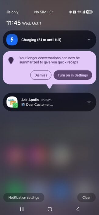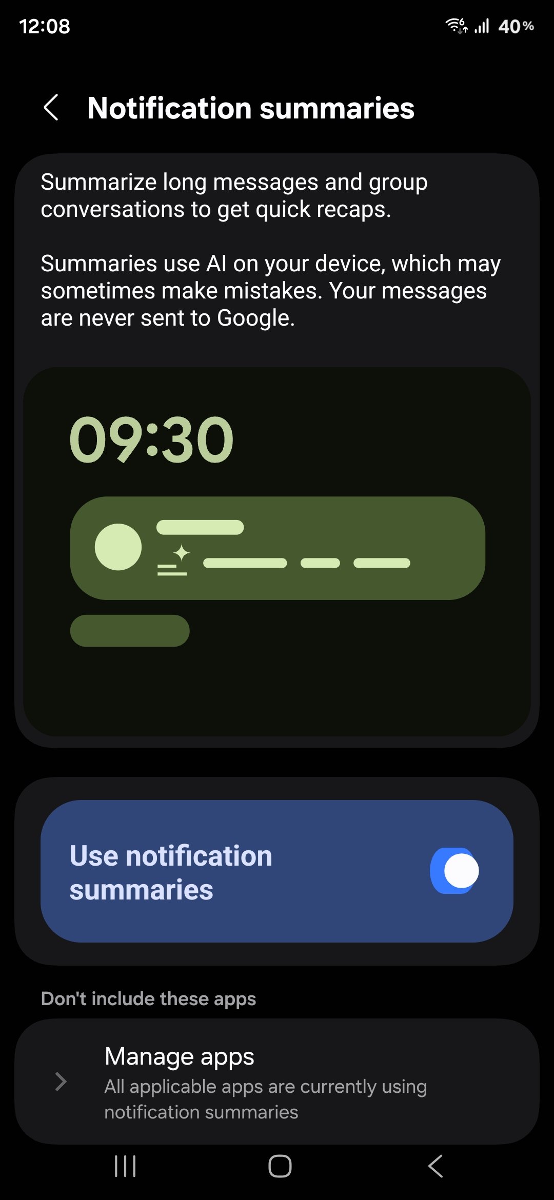 Funktionen är valfri och går att inaktivera från inställningarna. I dagsläget fungerar inte sammanfattningarna, vilket dock inte är konstigt med tanke på att One UI 8.5 inte ens är i betastadiet än. Förhoppningsvis blir Samsungs sammanfattningar bättre än motsvarande finessen i IOS.