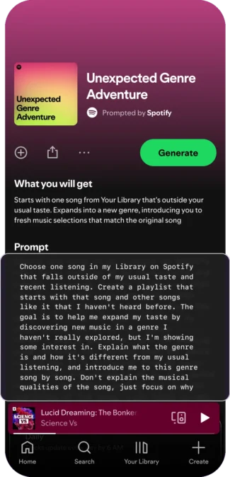 Spotify har introducerat promptade spellistor som låter oss beskriva exakt vad vi vill lyssna på och med vilka regler. Enligt Spotify går det att dra fördel av hela ens lyssningshistorik när spellistorna skapas.