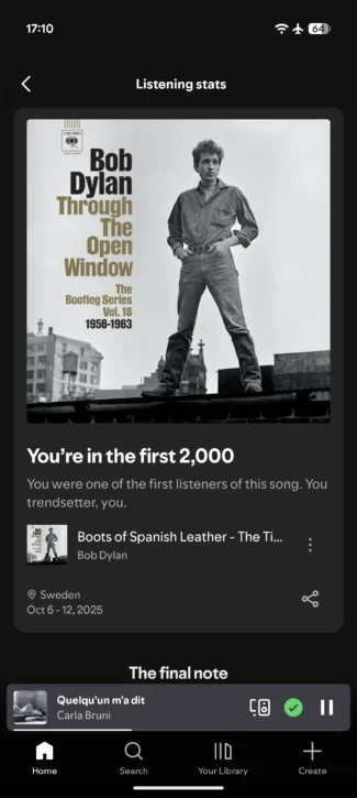 Appen blandar även in andra uppgifter i flödet, likt hur många timmar man lyssnat på en viss låt och ifall man var tidigt ute med att lyssna på nysläppt musik. Nyheten är tillgänglig för alla användare och vi ser redan statistiken i Androidappen.