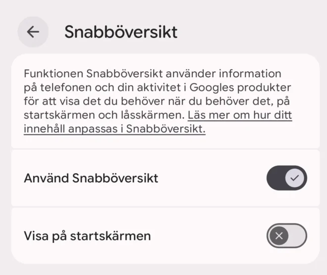 I betaversionen av Android 16 QPR3 kan Snabböversikten tas bort genom att långtrycka på en tom yta på hemskärmen, välja ”Startinställningar” och därefter trycka på ”Snabböversikt”. Det går att ha kvar widgeten på låsskärmen och bara ta bort den från hemskärmen.