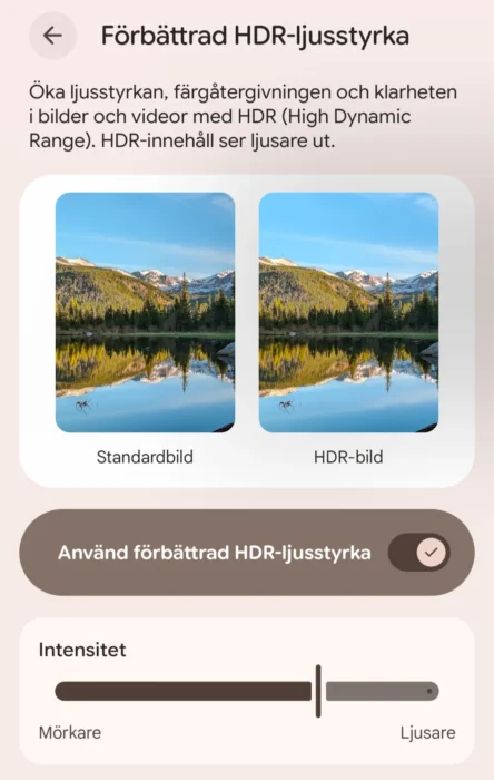 Utöver att stänga av ”förbättrad HDR-ljusstyrka” helt kan Pixel-användare även justera intensiteten från mörkast till ljusast. Om du har en Pixel och vill undvika bländning kan du med fördel sänka intensiteten efter behag. Nyheten nås från Inställningar > Visning och pekskärm > Förbättra HDR-ljusstyrka.