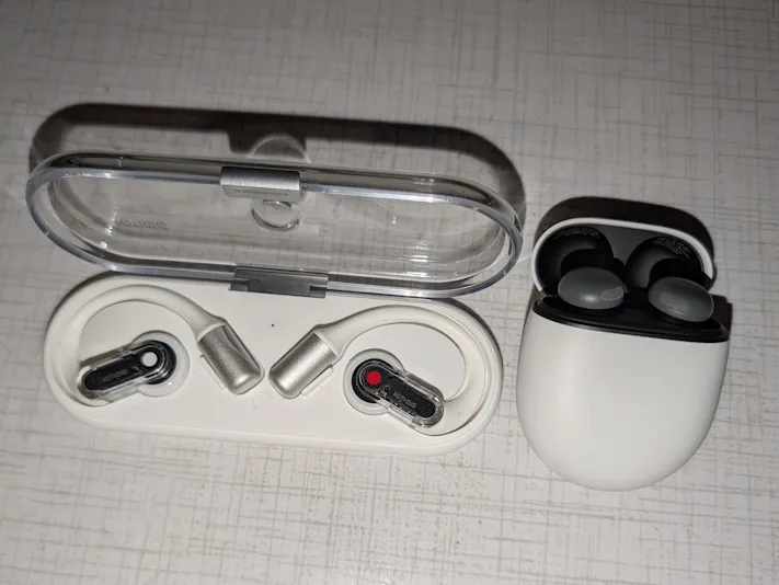 Idag är kategorin ”true wireless” mycket populär med ett stort utbud av helt sladdfria hörlurar av olika slag. Bilden nedan visar Nothing Ear Open och Google Pixel Buds Pro 2 : hörlurar med separata upplägg.