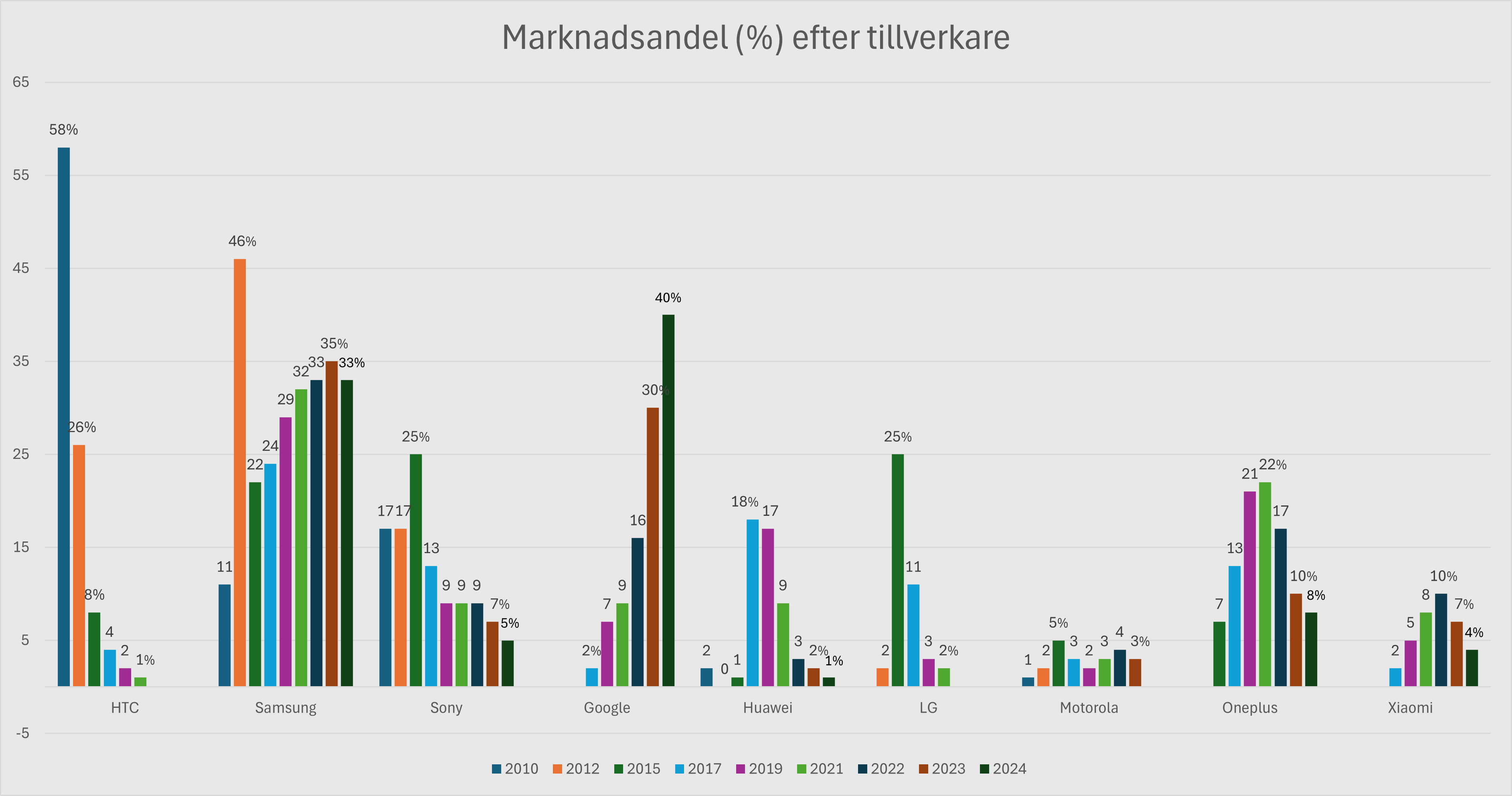HTC tappade främst andelar till Samsung som växte från 11 procent år 2010 till 46 procent år 2012. Samsung har inte varit större på Swedroid än just 2012 och föll till 33 procent förra året, medan Google klättrade tio procentenheter upp till hela 40 procent: första gången Google blev störst på Swedroid.