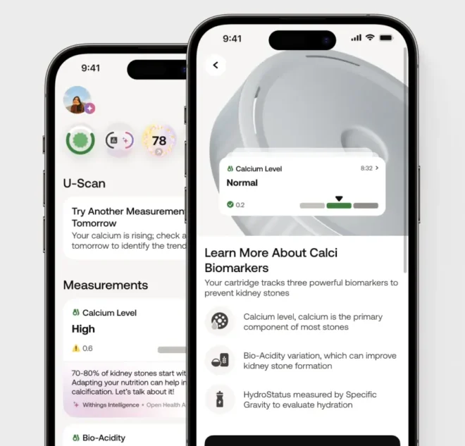 U-Scan Calci ska istället utgöra ett ”stöd för proaktiv njurhälsa” genom att analysera kalciumhalter, urinens PH-värde och hjälpa användare upprätthålla god vätskebalans. Batteritiden är upp till tre månader på en laddning och data skickas till smartphone över wifi. Abonnemanget Withings+ ingår i priset.